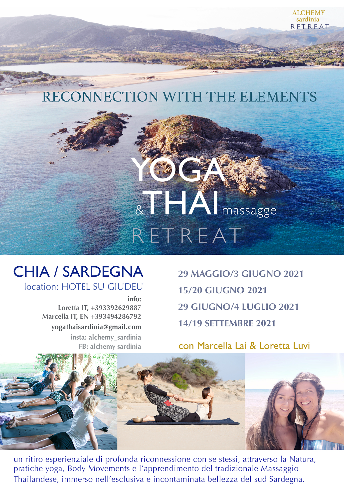 YOGA & THAI MASSAGE RETREATS in the beautiful SARDINIA, ITALY Join us and share amazing time and vibes in southern Sardinia, Chia (Italy). We are offering 6 days and 5 nights retreats, fully immersed in the amazing sea, nature and organic food, practicing Yoga, Body movements, learning Thai Massage, sharing…